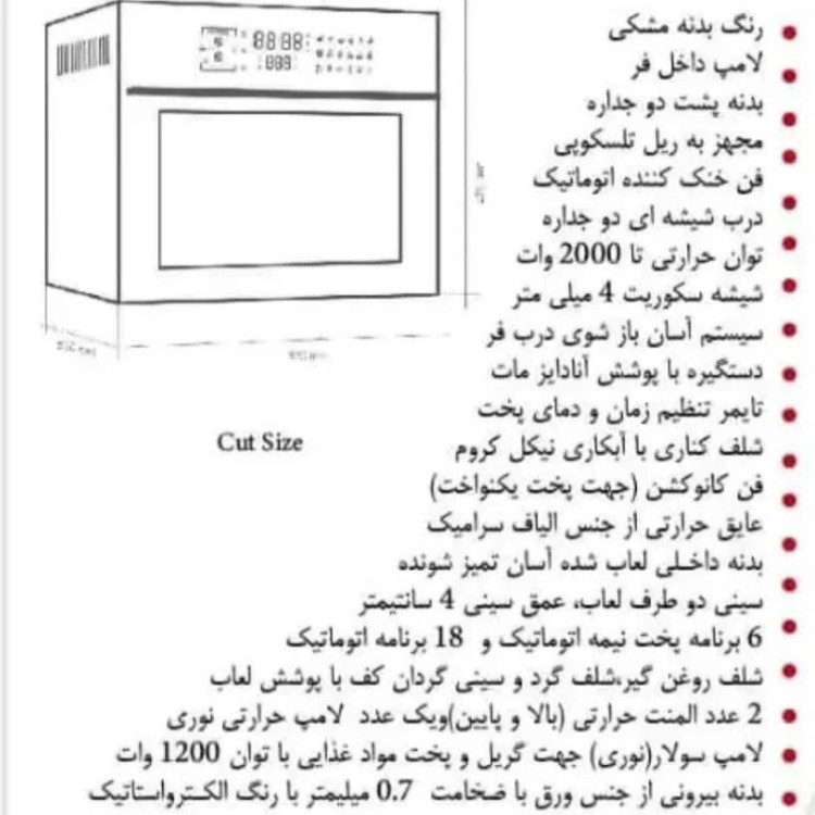 نوع عایق حرارتی : دارای عایق حرارتی الیاف سرامیکی جنس بدنه خارجی : ورق آهن با رنگ الکترواستاتیک (مشکی) جنس بدنه داخلی : بدنه داخل از جنس ورق روغنی با پوشش لعاب نحوه نصب : روکار توان حرارتی : ۱۵۰۰ وات سایر مشخصات دیگر : طراحی برد جدید دارای قفل کودک دارای فن کانوکشن حالت نصب( روکار) بدنه پشت دو جداره دارای لامپ داخلی فر دارای موتور جوجه گردان توان حرارتی تا ۱۵۰۰ وات دارای شیشه سکوریت مشکی دارای درب شیشه ای دو جداره بدنه دارای عایق حرارتی الیاف سرامیکی دارای دو عدد المنت حرارتی (بالا و پایین) دارای برنامه یخ زدایی از مواد غذایی منجمد دارای دستگیره آلومینیومی با پوشش آنادایز دارای سینی دو طرف لعاب (Easy to clean) بدنه داخل از جنس ورق روغنی با پوشش لعاب دارای ۶ برنامه پخت دستی و ۸ برنامه پخت اتومات دارای شیشه داخلی لوئی(بازتاب حرارت به داخل آون) بدنه بیرونی از جنس ورق آهن با رنگ الکترواستاتیک (مشکی) دارای سینی روغن گیر کف آون با پوشش لعاب esay to clean دارای شلف استیک و دستگیره سیخ جوجه گردان آبکاری شده