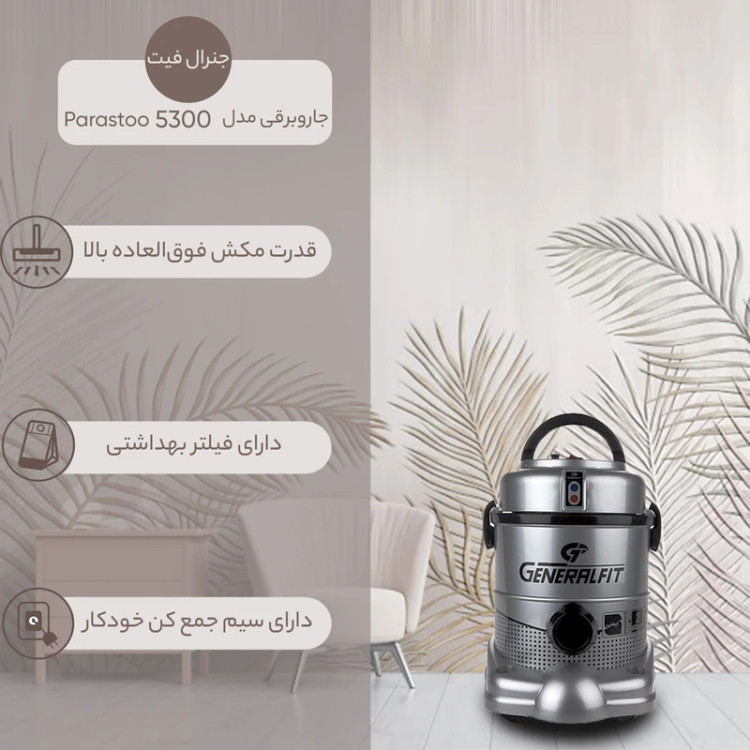 جاروبرقی «جنرال فیت» (General Fit) مدل «Parastoo 5300» از قدرتی زیاد و کیفیتی مطلوب بهره میبرد. این دستگاه که در ردیف جاروهای سطلی قرار میگیرد، گنجایش قابلتوجهی دارد و میتواند با توجه به کیفیت عملکرد و ویژگیهایش برای انواع منازل ویلایی،سالنهای بزرگ همچون فروشگاهها، مساجد و بهویژه رستوران و هتلها مورد استفاده قرار گیرد. جاروبرقی جنرال فیت مدل Parastoo 5300 از قطعات باکیفیتی ساخته شده تضمینکنندهی عملکرد و طول عمر زیاد آن است. این مدل دارای سیمجمعکن نیز هست که از مزایای این دستگاه محسوب میشود؛ برای استفاده از این قابلیت، پس از بیرون کشیدن کابل، بایستی بهوسیلهی دستگیرهای که در بالای جاروبرقی قرار دارد، سیم را جمع کنید. گفتنی است، چرخهای پایه بسیار روان هستند و قابلیت چرخش 360 درجهای دارند تا هنگامیکه آن را بهدنبال خود میکشید، واژگون نشود. این جاروبرقی دارای سریهای مختلفی هستند و هر کدام برای نظافت بخش خاصی طراحی شدهاند. کابل 6 متری دارد که به انعطافپذیری دستگاه افزوده است؛ چراکه در نظافت محیطهای بزرگ، میتوانید بهراحتی و بدون نیاز به اتصال جاروبرقی به پریز نزدیک، نظافت را انجام دهید. مدل Parastoo 5300 به موتور دو پروانه تکنولوژی AEG آلمان مجهز شده است و قدرت موتور 1300 واتی دارد که نقطهی قوت آن محسوب میشود؛ قدرت مکندگی این دستگاه در سطح ایدئالی قرار دارد و نظافت سریع و بیدردسر را فراهم میکند. دبی هوای این جاروبرقی 58dm3/sec است. این محصول دارای یک لولهی تلسکوپی است که به کاربر امکان تغییر ابعاد و تنظیم آن نسبت به محیط نظافت و قد خود را میدهد. مخزن جاروبرقی 21 لیتری است؛ جاروبرقیهای سطلی مخزن بزرگی دارند که نقطهی قوت آنها بهشمار میرود و دیگر نیازی نیست که به دفعات محفظه را خالی کنید.همچنین امکان نصب کیسه یکبار مصرف هپا فراهم شده است. جاروبرقی Parastoo 5300 آنتی استاتیک است؛ به عبارتی الکتریسیته ساکن جمع شده در پوسته دستگاه تخلیه میشود. این محصول دارای لوله خرطومی باکیفیت است؛ این لوله خرطومی از مواد درجهی یک ساخته شده تا بسیار بادوام باشد و با استفادهی چندین ساله و خمشهای متداول آسیبی نبیند